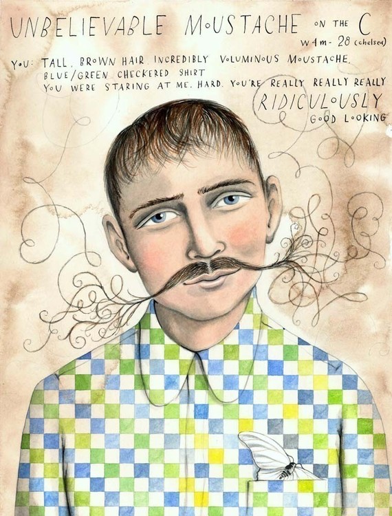 L// It's strange but I'm suffering from a project crush on Sophie Blackalls missed connections.. I will let her explain "Messages in bottles, smoke signals, letters written in the sand; the modern equivalents are the funny, sad, beautiful, hopeful, hopeless, poetic posts on Missed Connections websites. Every day hundreds of strangers reach out to other strangers on the strength of a glance, a smile or a blue hat. Their messages have the lifespan of a butterfly. I'm trying to pin a few of them down." I love knowing that these messages come from people living in new york. Such a big city, but people are still reaching out to each other, even if the odds are impossible, to say things they couldn't say face to face... it's just sweet. A lovely side of humanity.